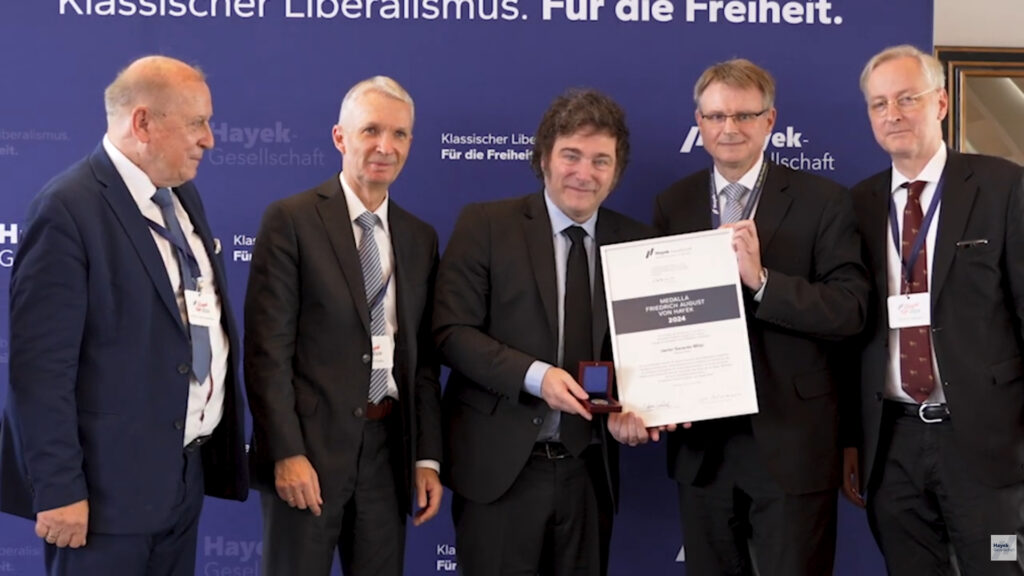 Heute ist die Hayek-Gesellschaft aktiv wie nie. Im Juni 2024 richtete sie in Hamburg den Kongress »Hayek-Tage 2024« aus, auf dem sie den extrem rechten argentinischen Staatspräsidenten Javier Milei mit der »Hayek-Medaille« auszeichnete. Dass Milei persönlich nach Hamburg reiste, um den Preis entgegenzunehmen, kann die Hayek-Gesellschaft als politischen Coup verbuchen. Milei wurde vom Publikum mit »Libertad!«-Rufen gefeiert. Anwesend waren unter anderem Hans-Georg Maaßen von der WerteUnion und Beatrix von Storch von der AfD, beide sind Mitglieder der Hayek-Gesellschaft. Bei der Preisverleihung posieren neben Milei vier Vorstandsmitglieder der Gesellschaft: Gerd Habermann, ein umtriebiger Lobbyist im proprietaristischen Spektrum; Gerhard Papke, ehemaliger Vizepräsident des Landtags in Nordrhein-Westfalen; Stefan Kooths, Leiter des Prognosezentrums im Kieler Institut für Weltwirtschaft; sowie Carlos A. Gebauer, Rechtsanwalt in Düsseldorf. Sie allen sind Mitglied der FDP.