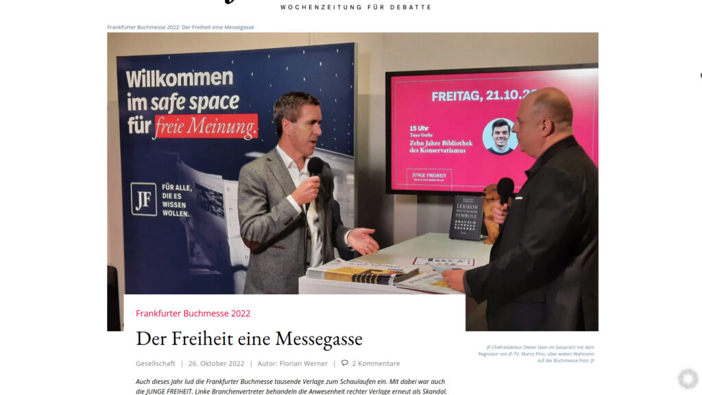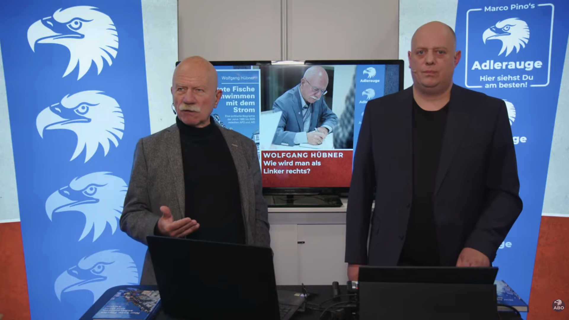 Knapp 100 rechte Verlage, AutorInnen und MedienmacherInnen präsentierten sich dort mit eigenen Ständen. Auch aus Frankfurt waren Ausstellerinnen vertreten, so das proprietaristische Magazin Tichys Einblick des Frankfurter Verlegers Roland Tichy, das in der rechten VerschwörungsszeneAls rechte Verschwörungsszene, rechte Verschwörungsbewegung oder rechtes Verschwörungsmilieu bezeichnen wir das Spektrum der Personen, die eine Verschwörungsmentalität und eine geteilte Identität als »Freiheitsbewegung« und »Wahrheitsbewegung« verbindet. Die Angehörigen der Szene organisieren sich in analogen und virtuellen Gruppen und Plattformen und verfügen über ein eigenes Netzwerk »alternativer Medien«. Mit den Corona-Protesten Anfang 2020 bildete sich eine Bewegung heraus, die sich beständig… Weiterlesen entstandene Unternehmen KRASSER GURUDie KRASSER GURU GbR betreibt eine Ticket-Plattform, einen Verlag und einen Buchshop für die Spektren von rechter Verschwörungsszene, Alternativmedizin, Esoterik und Proprietarismus. Das Unternehmen hat seinen Sitz in Frankfurt. Es vermarktet bundesweit Kongresse, Seminare, Shows, Konzerte und Live-Vorträge u.a. von Kayvan Soufi-Siavash, Daniele Ganser und Thilo Sarrazin, der 2010 das rassistische und sozialchauvinistische Buch »Deutschland schafft sich ab« verfasste. Geleitet wird… Weiterlesen, der extrem rechte Ehrenvorsitzende der Bürger für Frankfurt Wolfgang HübnerWolfgang Hübner saß von 2001 bis 2016 Jahre für die rechtspopulistische Wählervereinigung Bürger für Frankfurt (BFF) im Frankfurter Stadtparlament und ist heute deren Ehrenvorsitzender. Er betreibt seit mehreren Jahren Politik für und mit der AfD, der er bereits von 2013 bis 2014 angehört hatte. Hübner ist regelmäßiger Autor im extrem rechten Blog PI-News. In Beiträgen für die Klartext-Bürgerzeitung hetzt er… Weiterlesen – und das YouTube-Format Marco Pino’s Adlerauge. So neu wie der Name ist, so altbekannt ist deren Macher: Der heute 46-jährige Marco Pino, der schon um 2010 mit extrem rechten Aktivitäten in die Öffentlichkeit drang.