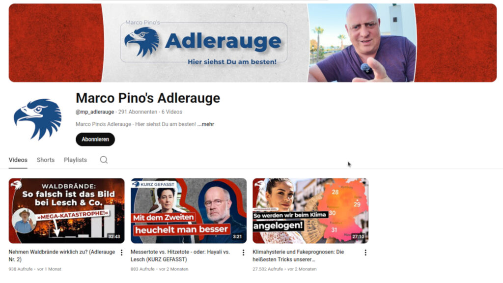 Marco Pino ist YouTuber und Filmemacher mit einem Unternehmen in Frankfurt. Seit über 15 Jahren tritt er als selbsternannter Experte für Themen auf, die auf der rechten Agenda stehen: Islam, Migration, Klima, Impfungen, Gender und manches mehr. Dazu verbreitet er falsche Behauptungen und Hetze und leugnet die Fakten des Klimawandels. Pino arbeitet unter anderem für die AfD und die Zeitschrift Junge Freiheit und schafft mit seinen Filmen einen enormen Output rechter Propaganda. Im Sommer 2025 startete er sein eigenes YouTube-Format Marco Pino’s Adlerauge. Damit will er sich nun politisch »austoben«.