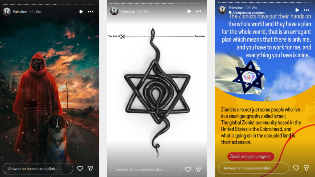 Zur Rechtfertigung des Terrorangriffs nutzt Hussaini eine offen antisemitische Bildsprache. Die USA gelten als dämonische Gestalt und Jüd*innen und Juden als dessen Schoßhunde. Einer zum Davidstern geformten Schlange soll der Kopf abgeschnitten werden und angeblich haben Zionist*innen einen Plan zur Unterjochung der Welt.