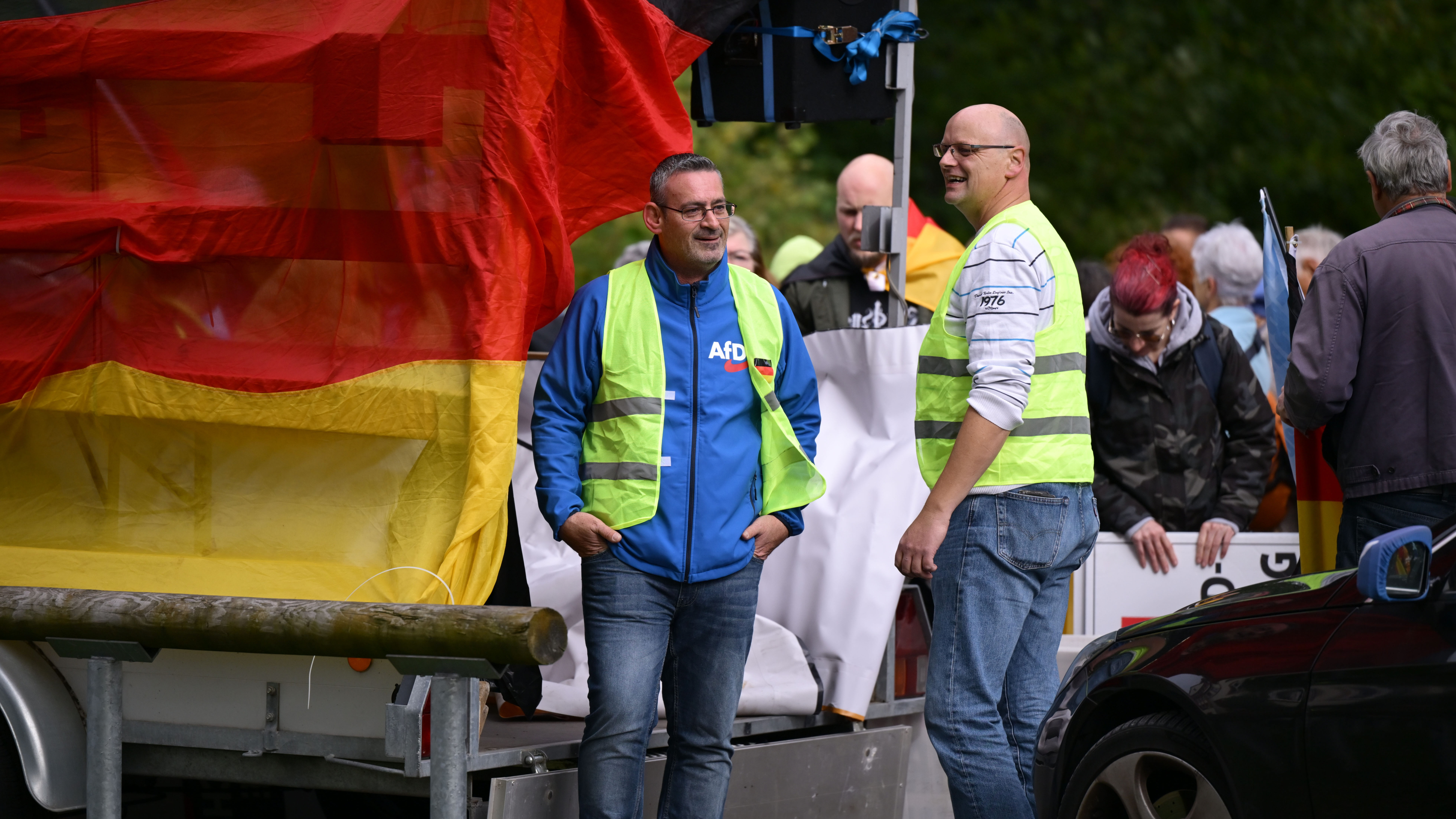 Sven Müller (links) und Michael Hetzel bei der von beiden angemeldeten Demonstration »Gegen den rot-grünen Sumpf und ihre Antifa-NGO Freunde« am 3. Oktober 2025 in Aschaffenburg. © dokunetzwerk rhein-main